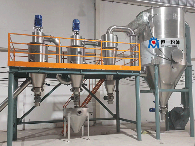 分级机与进料器、旋风分离器、除尘器、引风机、控制系统组成一套分级系统。物料在负压风作用下通过进料器定量上升至分级区,在高速旋转的分级涡轮产生的强大离心力作用下,使粗细物料分离,符合粒径要求的细颗粒通过分级叶片间隙进入旋风分离器或除尘器收集,粗颗粒夹带部分细颗粒撞壁后速度消失,沿筒壁下降至二次风口处,经二次风的强烈淘洗作用,使粗细颗粒分离,细颗粒上升至分级区二次分级,分离后的粗颗粒通过卸料器排出。
